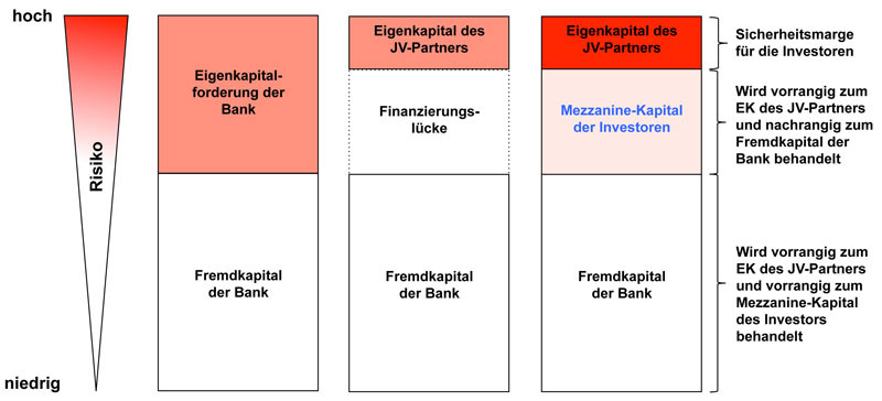 Der Begriff „Mezzanine“ stammt ursprünglich aus der Architektur und bedeutet so viel wie „Zwischengeschoss“, was die hybride Struktur der Finanzierungsform zwischen Eigen- und Fremdkapital widerspiegelt. Bei Projektentwicklungen fungiert Mezzanine-Kapital als Eigenkapitalersatz bzw. -ergänzung für Projektentwickler.